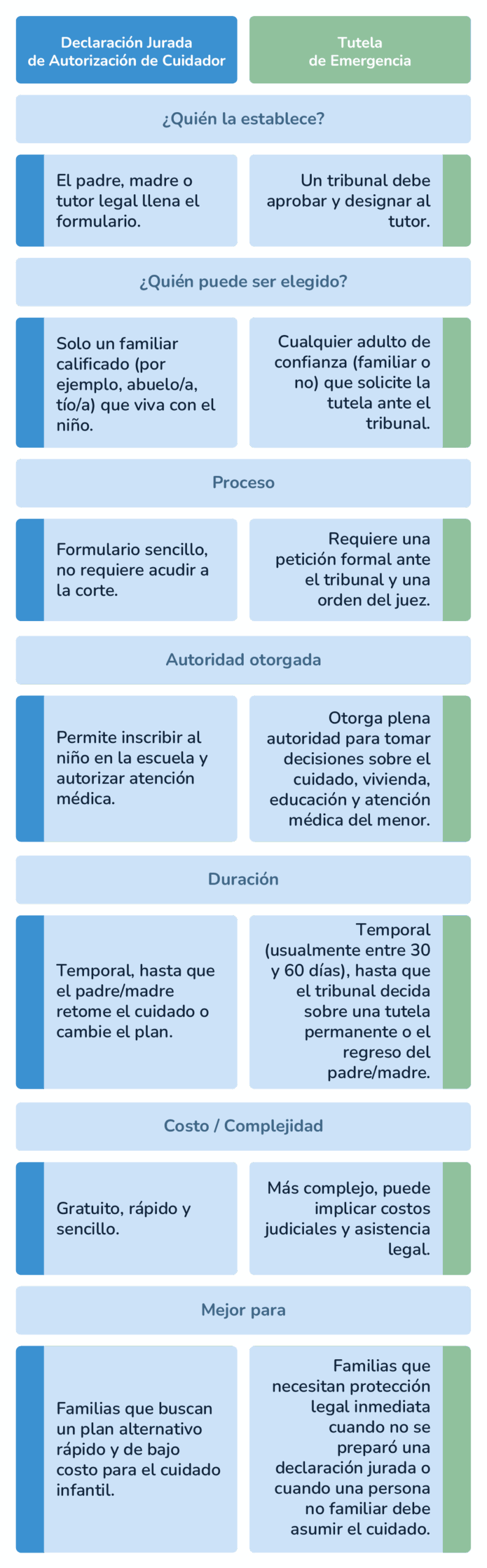 A continuación, encontrará una comparación entre la Declaración Jurada de Autorización de Cuidador y la Tutela de Emergencia, para ayudarle a entender cómo funciona cada opción.